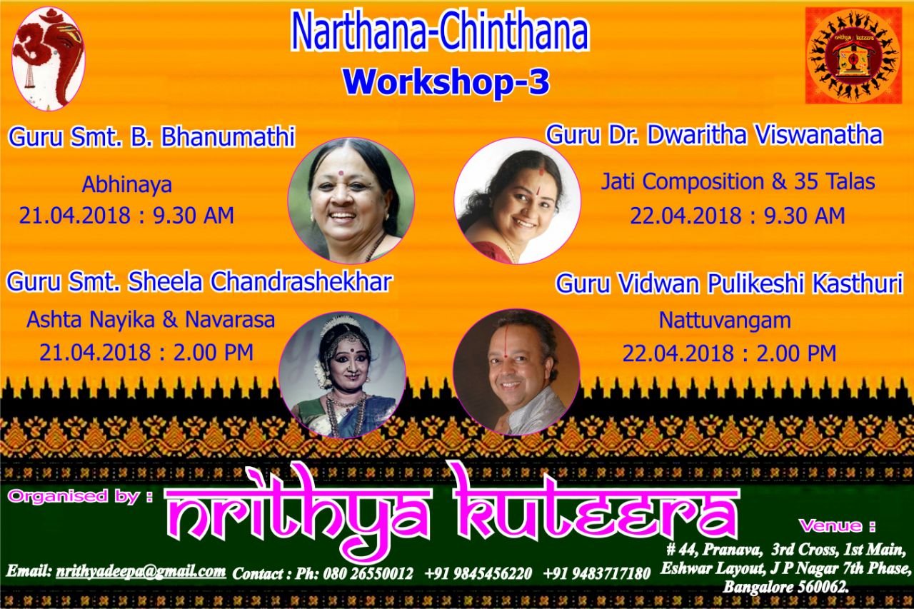 Vid. Guru Deepa Bhat is a firm believer in "fun learning." Academics can be tedious, thus Nrithya Kuteera hosts annual workshops called "Narthana Chintana" to keep things interesting. These workshops are centered on a variety of dance-related themes.